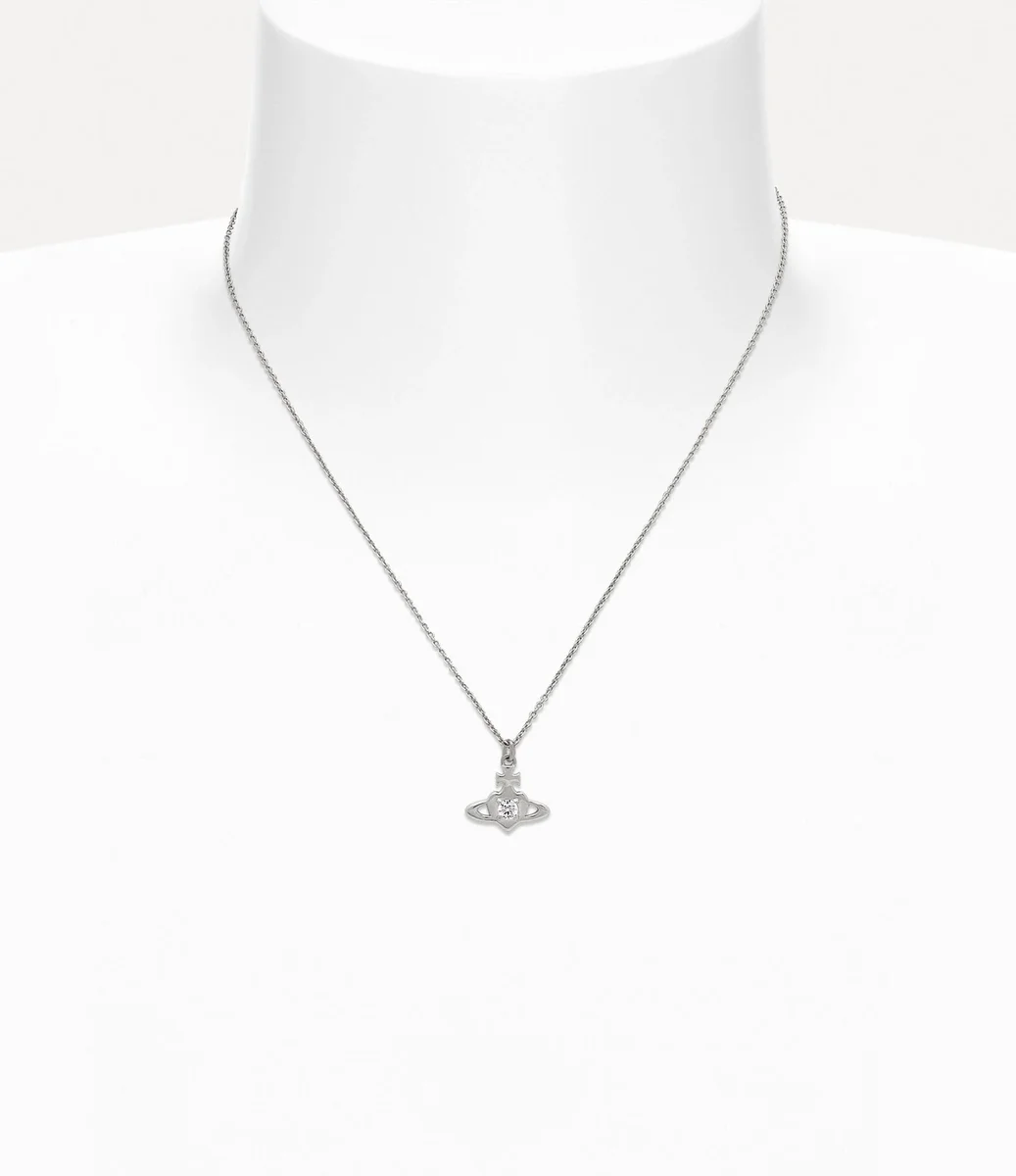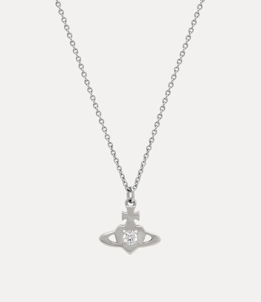 Our Noella Pendant necklace features a platinum-tone finish, adorned with a heart orb motif, recalling Vivienne’s affection for humanity and the planet. Crafted from recycled silver, the piece is embedded with a white crystal in the centre of the design.