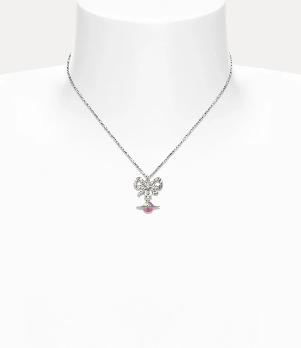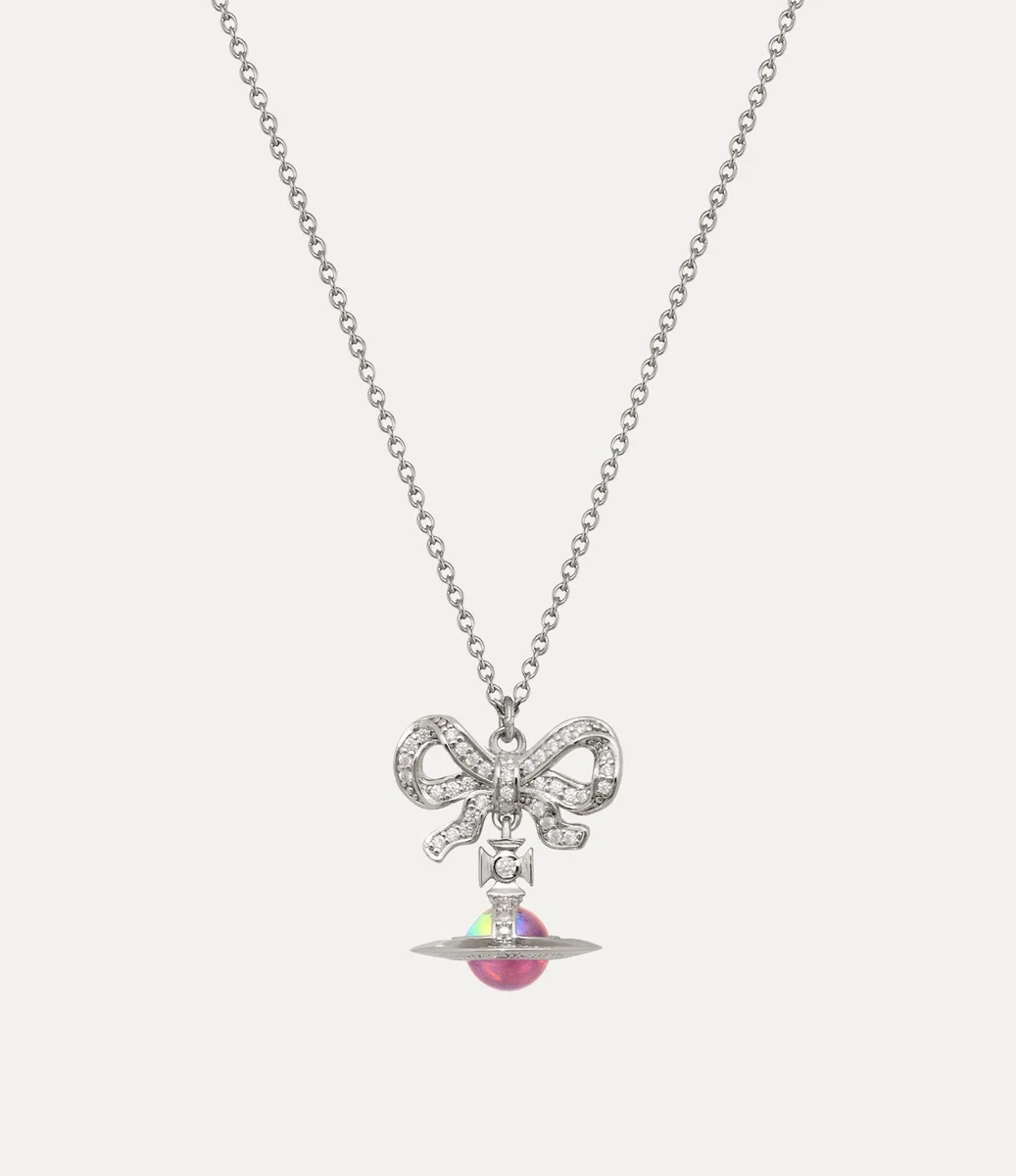 Our Octavie Pendant necklace is crafted from recycled silver and finished with polished platinum-tone plating. Embellished with sparkling white crystals, the design combines a Georgian-style bow with our signature three-dimensional orb at the centre, rendered in a pink iridescent finish, echoing the house’s classic orb motif.