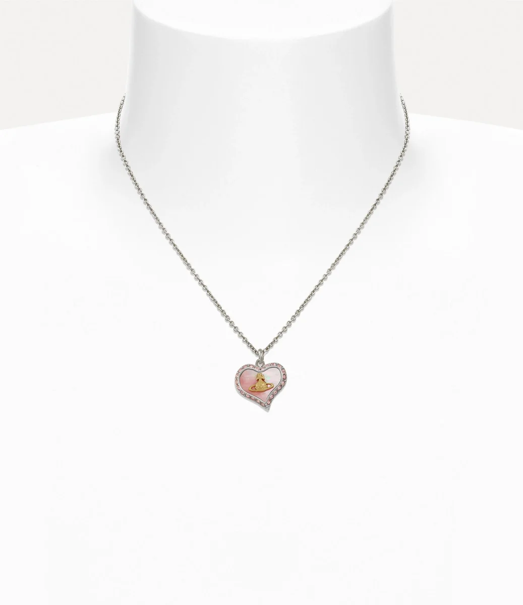 Vivienne Westwood Petra Pendant necklace in silver-tone plating features an asymmetric heart motif with rose crystals and a gold-tone orb logo on the front.
