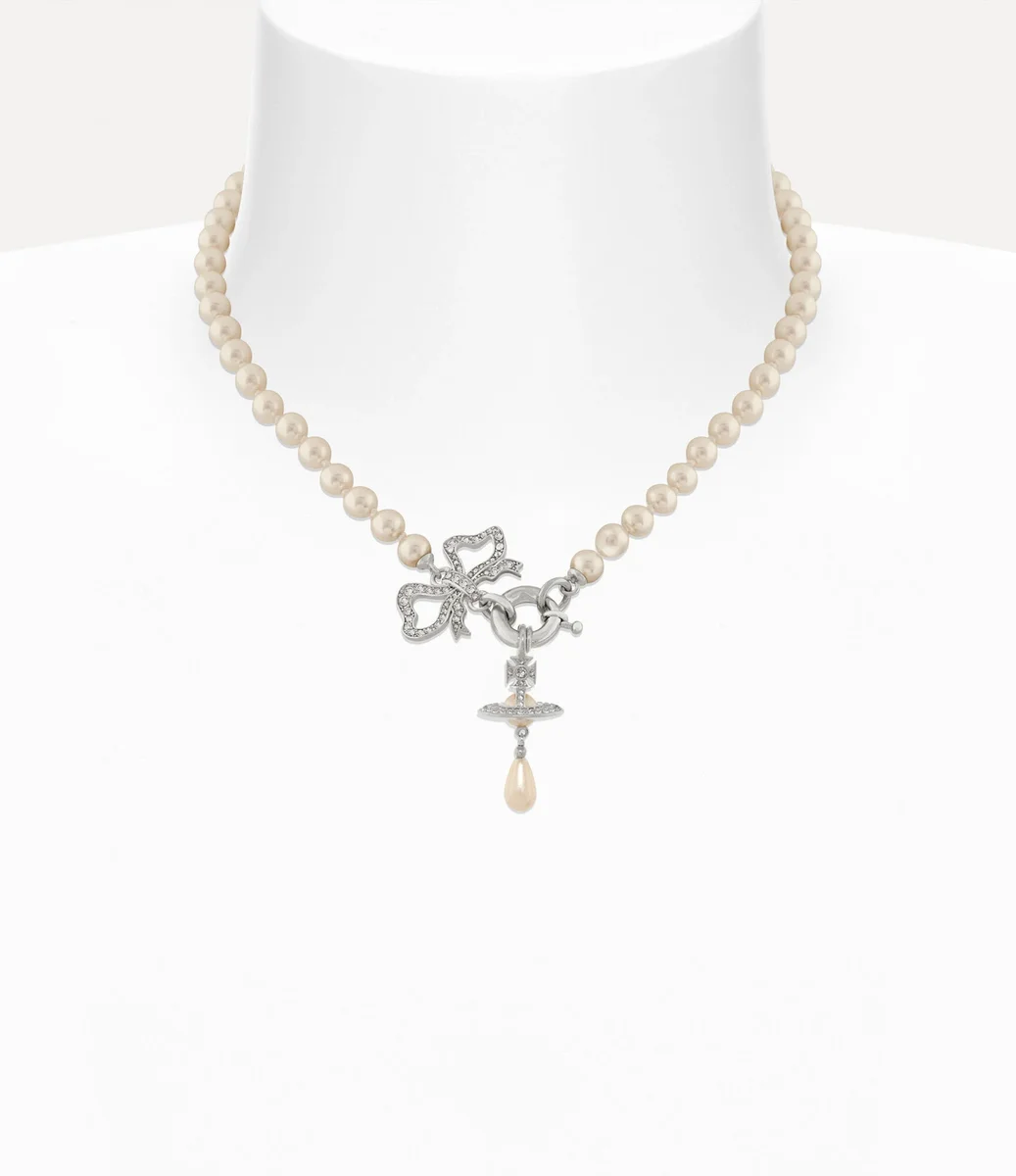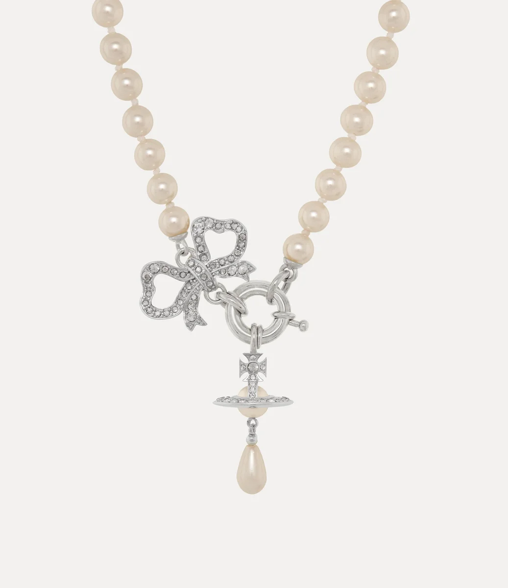 Vivienne Westwood Rigoberta Pearl necklace features a row of Swarovski glass pearls, bow motif and three-dimensional orb motif with a spring-lock fastening.