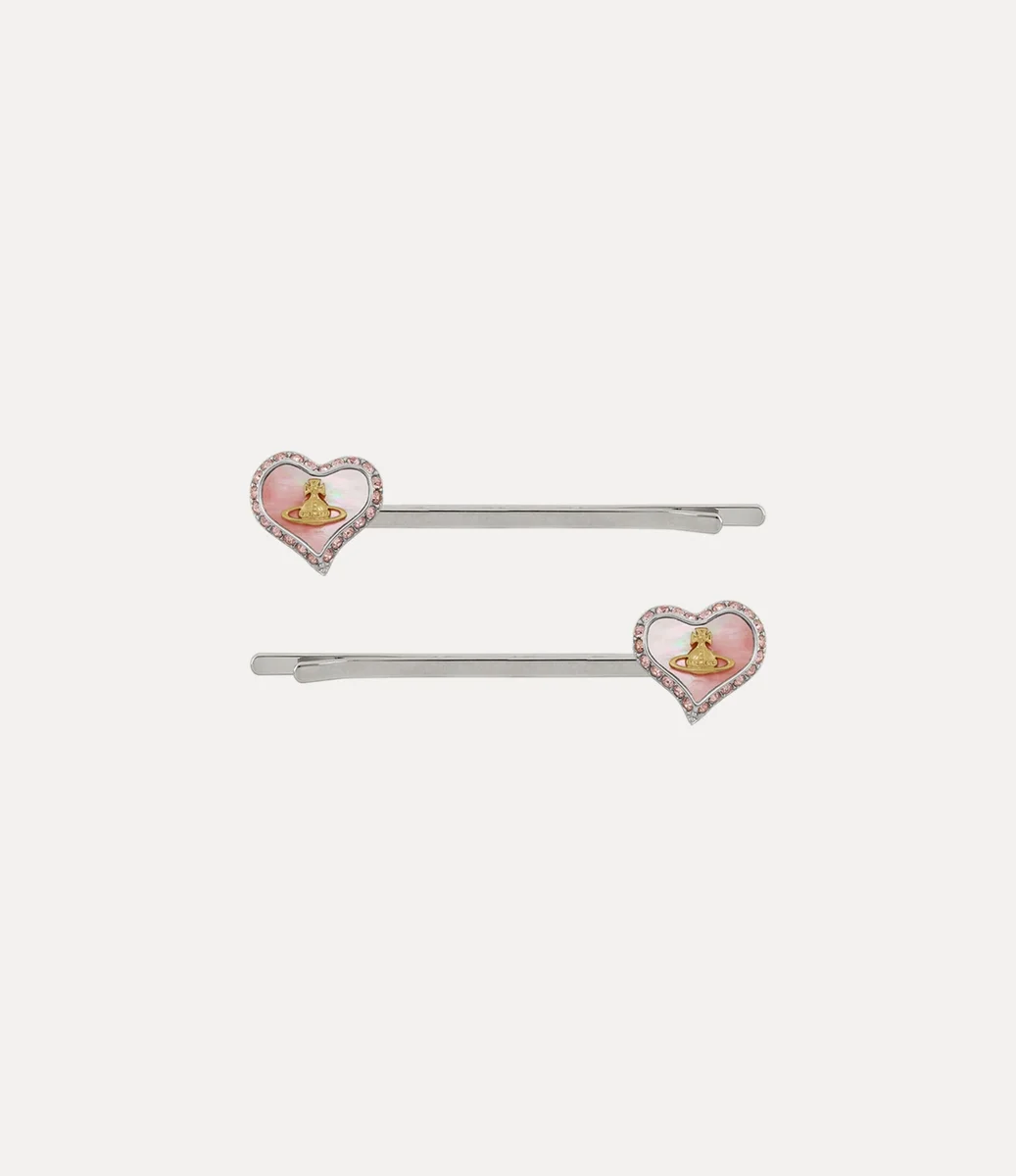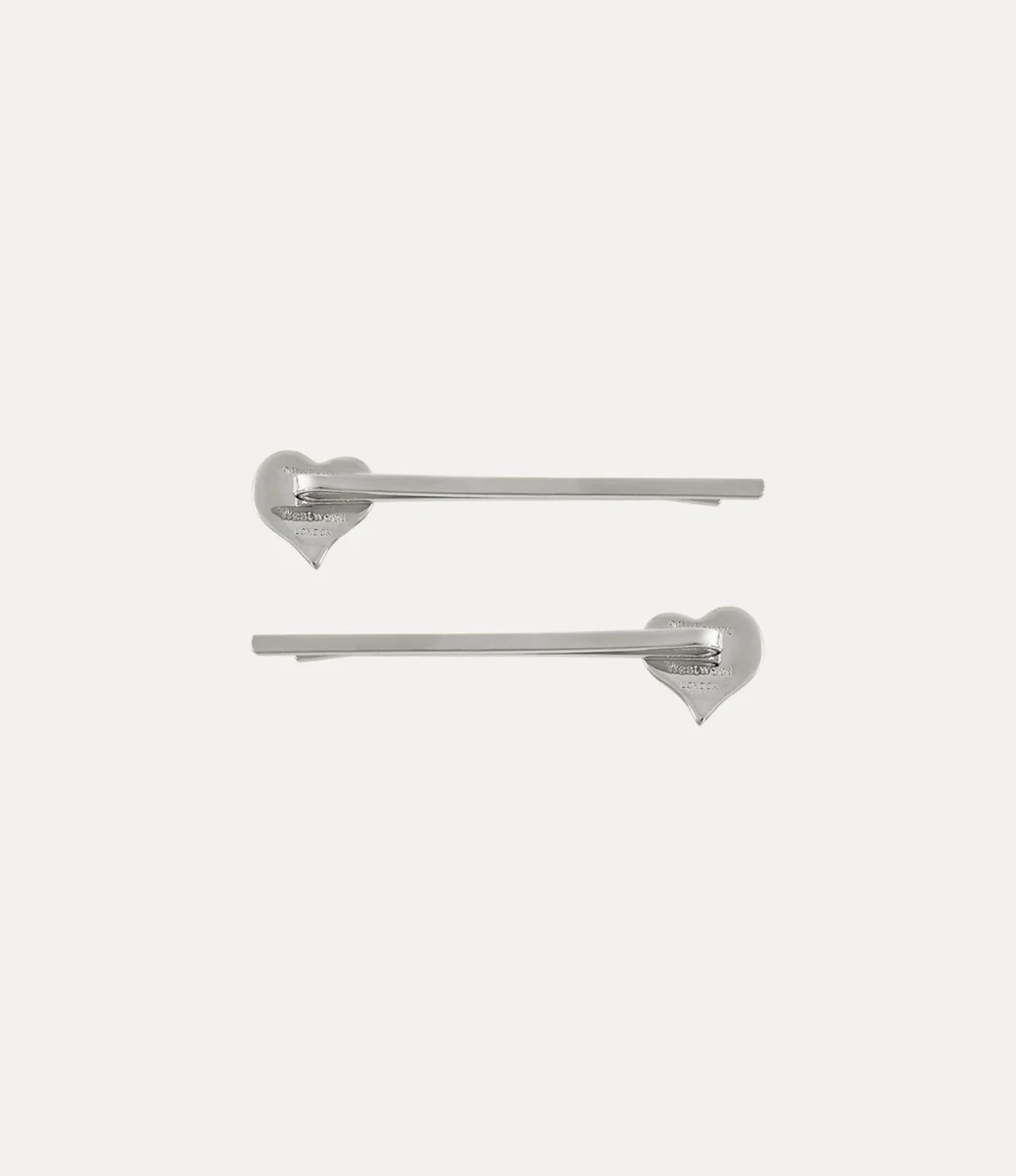 Vivienne Westwood silver-tone Petra Bobby pins with an asymmetric heart shaped motif, complete with crystal details and an orb in the centre of the design.
