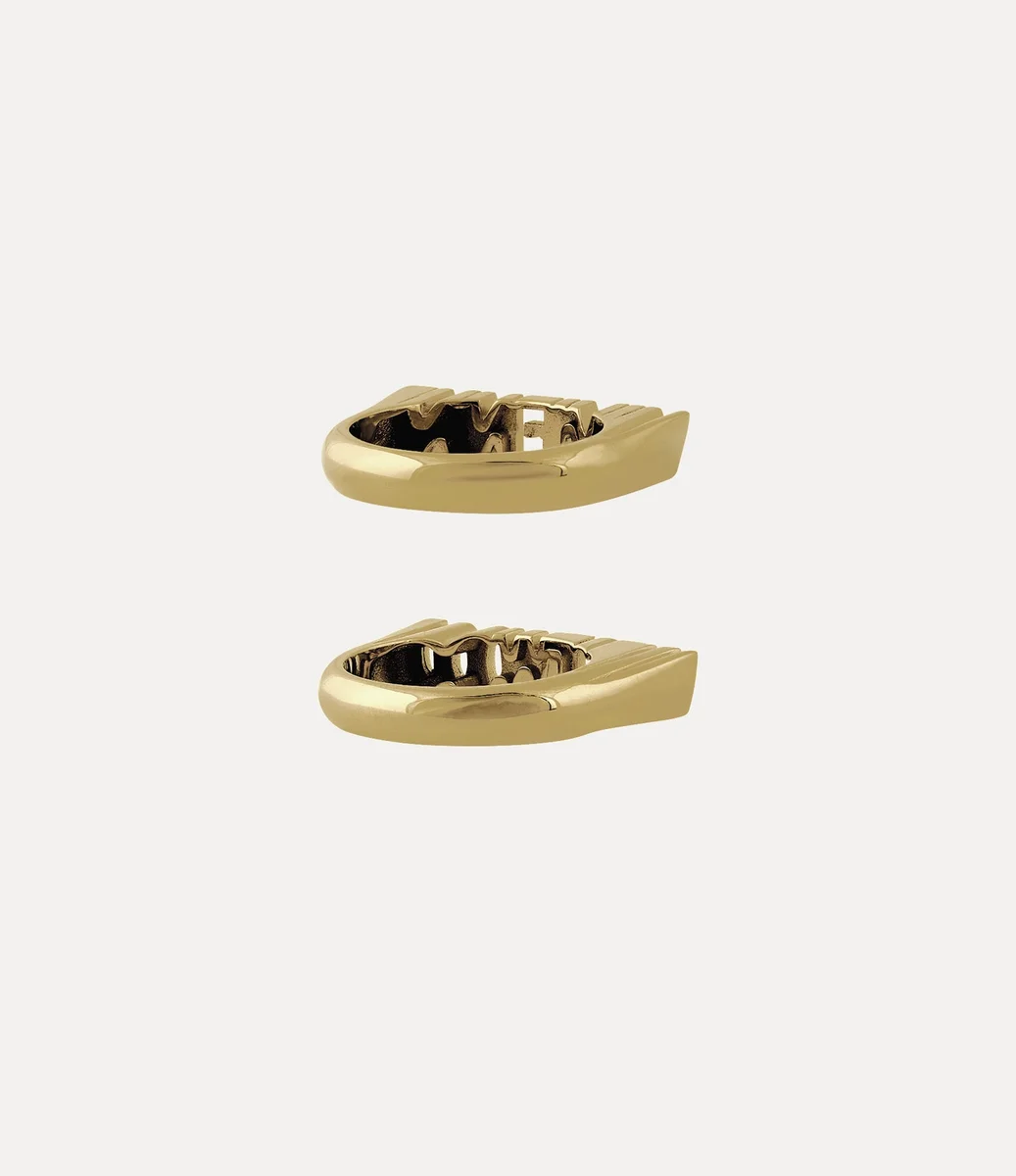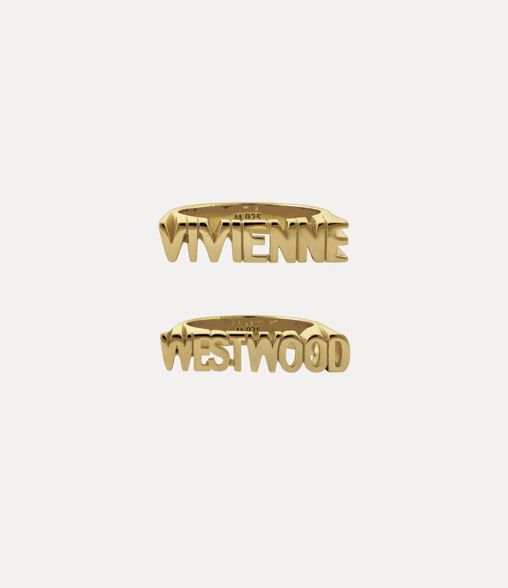 Our Essex ring is crafted from recycled silver and finished with polished gold-tone plating. Featuring two bold, all-metal bands, one spelling ‘Vivienne’, the other ‘Westwood’, the design is accentuated with intricate cut-out details that trace the contours of each letter.