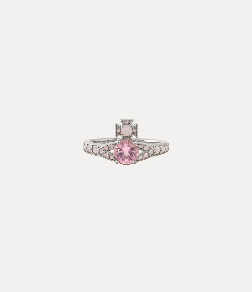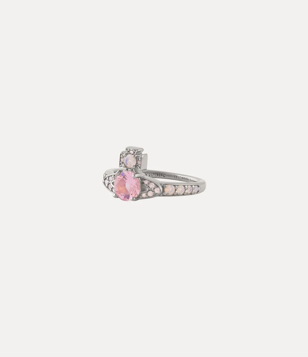 Vivienne Westwood Ismene ring in recycled silver features a platinum-toned finish and a crystal-encrusted slim band, complete with pink crystals.
