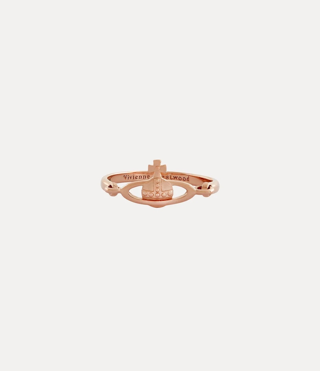 Our Vendome ring in pink-gold tone sterling silver features a delicate banded design, complete with a cut out orb motif on the face that is able to rotate on its hinges – synonymous with Vivienne’s vision of taking tradition into the future. To finish, the piece is inscribed with our house’s signature typography motif on the inner side.