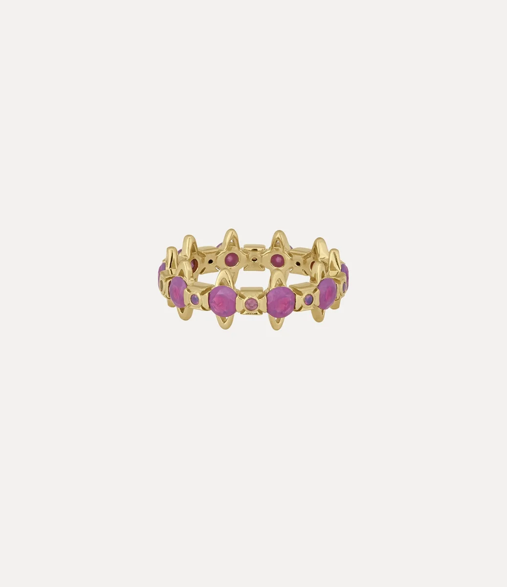 Our Warwick ring offers a sleek recycled silver design, featuring a band of interconnected orb details in a polished, gold-tone plating. The piece is designed with purple crystal embellishments at the centre of each orb, complemented by small gemstones mounted into the cross top.
