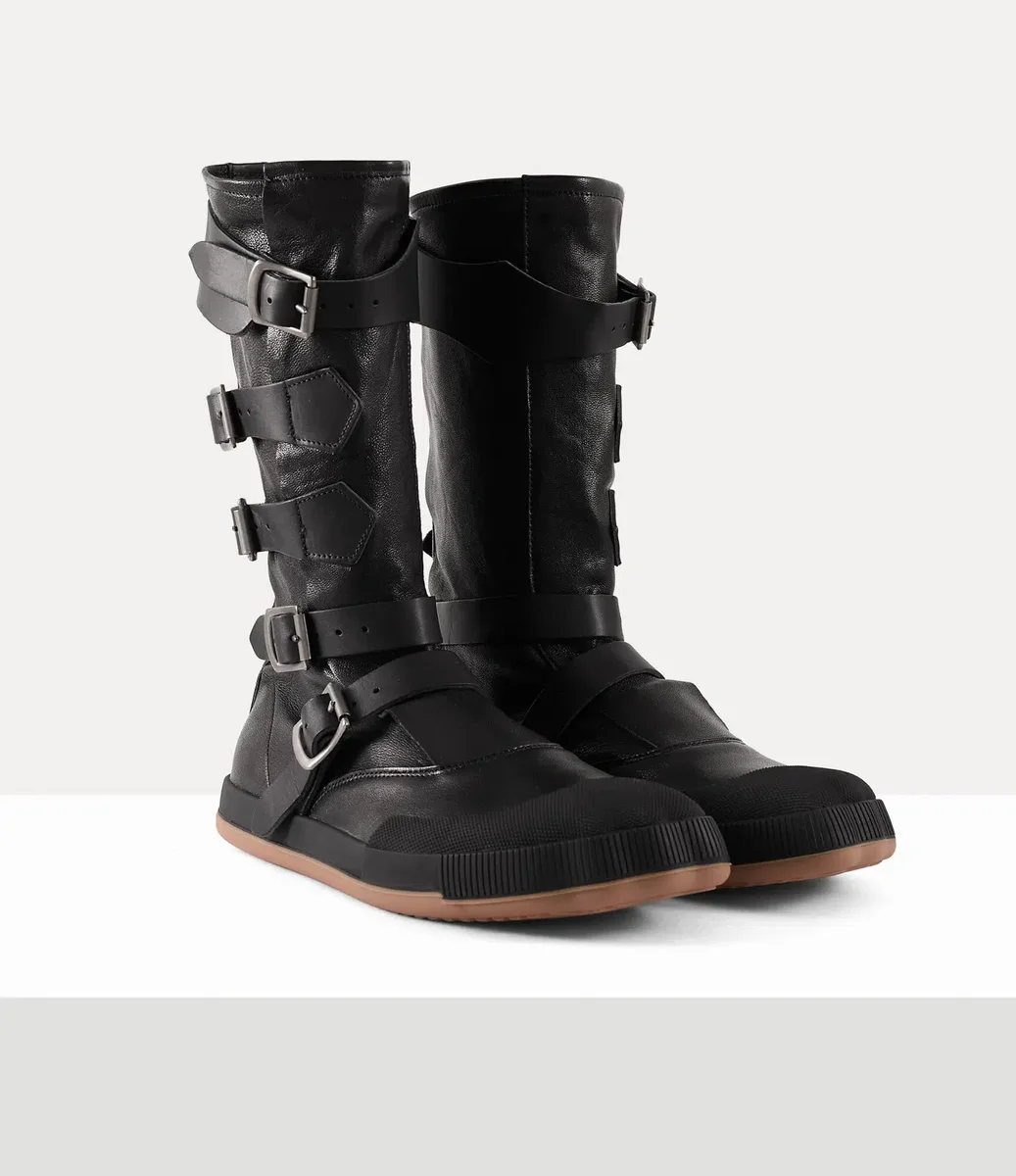 Vivienne Westwood Animal Pirate boots pay homage to the original design, featuring slouchy leather and oversized buckles, with an animal-inspired toe shape.