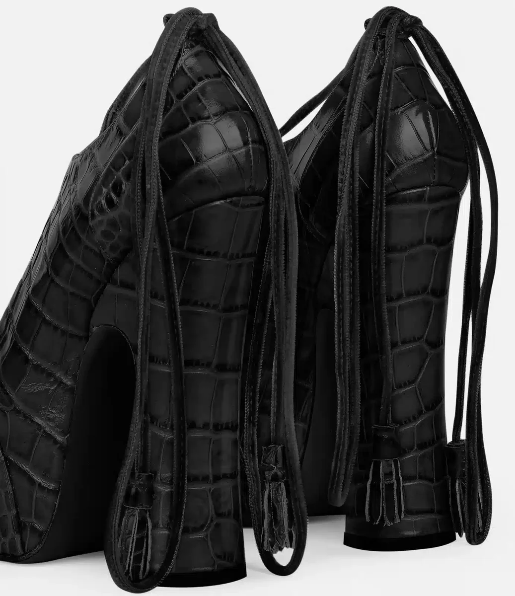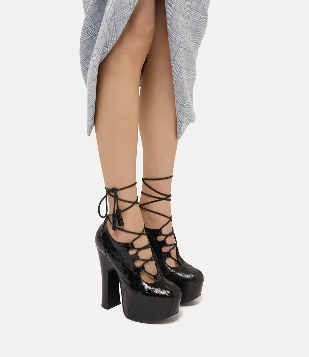 Inspired by Scottish Highland regalia, our Elevated Ghille platforms reinterpret the classic ghillie brogue, offered with a croc-effect embossed motif across the design. The piece features a short, rounded front with signature cut-out accents, complete with long tassel laces that wrap around the ankle.